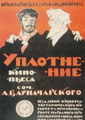Сам по себе фильм "Уплотнение" никакой художественной ценности не несёт. Это вполне рядовая пропагандистская лента, поставленная крайне наивно и примитивно. Фильм рассказывает о заслуженном профессоре, симпатизирующем советской власти, у которого старший сын является врагом революции, а младший находится на распутье. В квартиру к профессору подселяют рабочего с дочерью, а затем их начинают посещась другие рабочие завода. Далее перед зрителями разворачивается прямо-таки идиллическая картина, не имеющая ничего общего с существовавшей тогда реальностью. Профессор проводит среди новых жильнов культурную работу, читает им лекции, а между его младшим сыном и дочерью рабочего возникает любовь. В тон фильму и прстер, изображающий по-братски обнимающихся профессора и рабочего... Да, это вам не "Собачье сердце"...